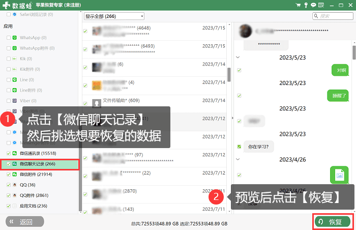 3. 等待软件扫描完成后,选择需要恢复的聊天记录,点击“恢复”即可。