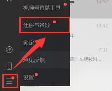 第1步:在电脑上点击微信的【设置】 图标,在弹出菜单栏中选择【迁移与备份】 。
