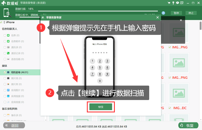 第2步:在手机上输入密码并【信任此电脑】 ,输入正确密码后会自动进行数据扫描。