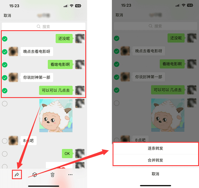 第2步:选中后点击【转发】 ,然后再根据自己喜好选择【逐条转发】 或者【合并转发】 。小编建议选择【合并转发】 ,更加简单快捷,最重要的是能够清晰明了地展示上下文的关系。