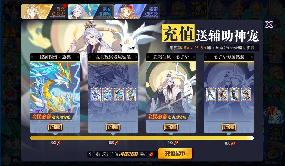 这两个亚比,都是需要用到专属钻装的(龙王敖兴不用专属可以勉强使用,姜子牙没有专属玩不转)。而这两个亚比(含钻装),都可以通过充消赠送的方式获得。
