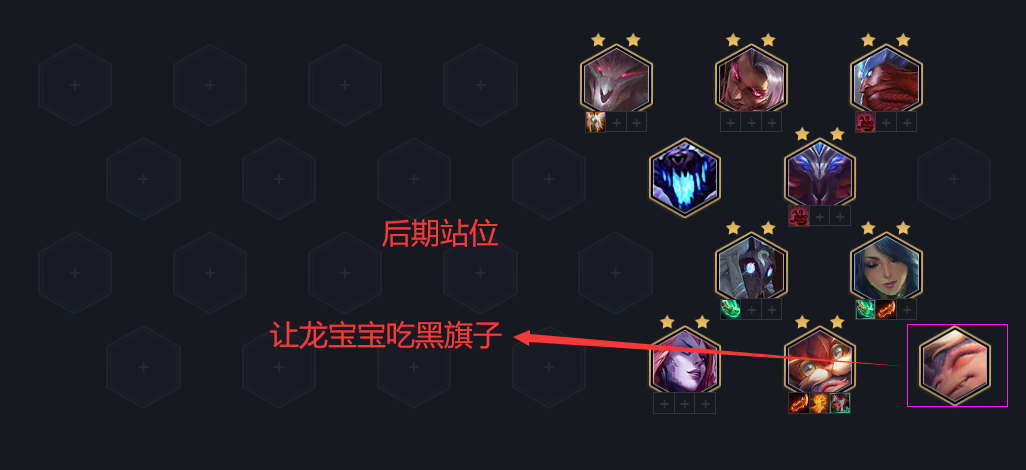 后期站位是比较考究的,尤其是龙宝宝,一定要吃到黑旗子的效果,因为相比其他英雄,龙宝宝的影响是最小的,基础攻速仅有0.4左右,影响微乎其微,而放在角落,还可以避免被锤石控制(龙宝宝自带控制免疫效果),也防止刺客直接将龙宝宝击杀。