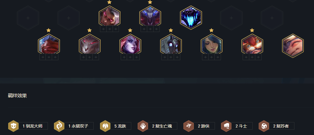一套强力且完整的阵容,必须有扎实的前排,足够的控制能力,以及强大的核心输出英雄,整套阵容构成由:5龙族+2游侠+2复生亡魂+2斗士+2复苏者组成。