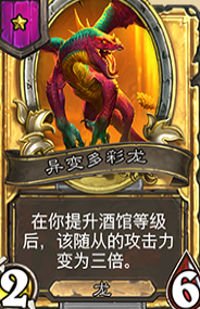1.一本-变异多彩龙:在你提升酒馆等级后,该随从的攻击力翻倍。