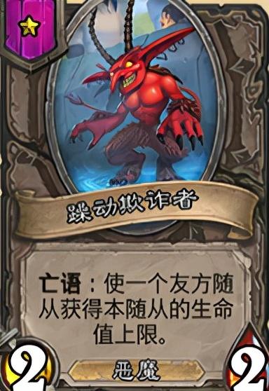 该随从的被动衍生出一些新奇的打法,通过鹦鹉触发恶魔躁动欺诈者的亡语,将其血量传给,泰蕾苟萨。这个阵容非常好凑,有时到一场游戏结束,泰蕾苟萨能有上千的血量。