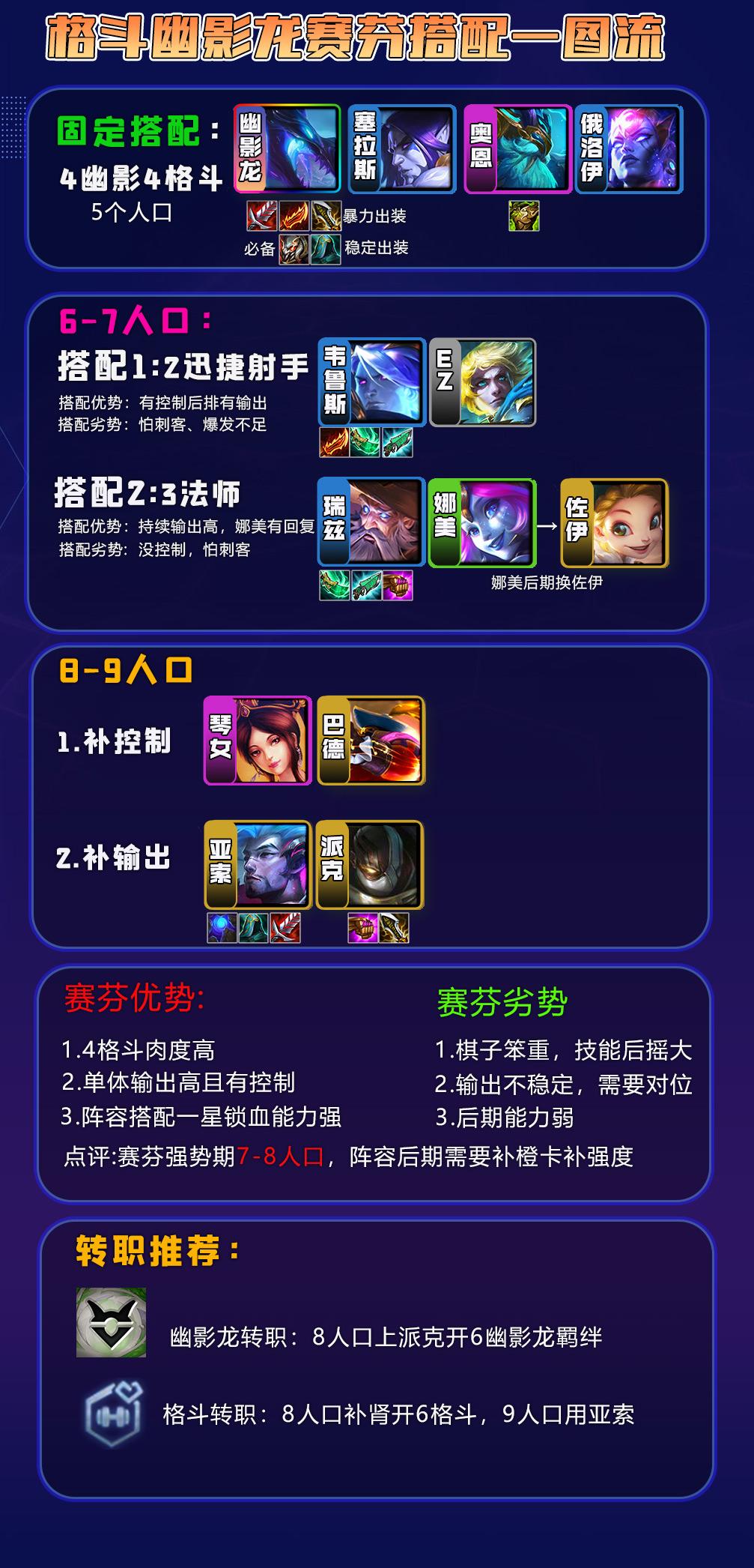 本期给大家带的是一套非常简单的龙族442阵容—4幽4格斗2迅捷射手。这套阵容过渡简单,成型强度高,非常适合新赛季上手使用。