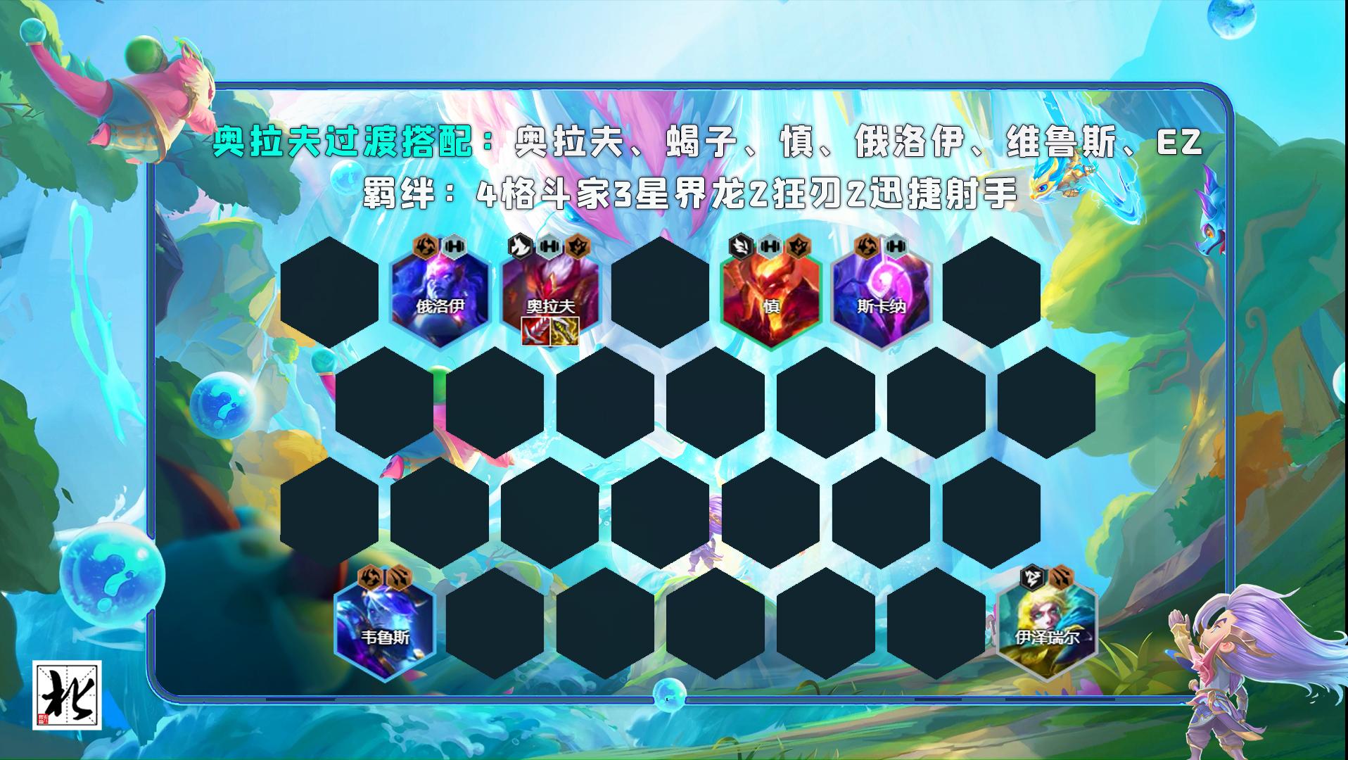 比如嫖到奥拉夫,同时有4格斗羁绊可以开,强度是高于后排配老鼠寒冰等过渡带装备过渡。