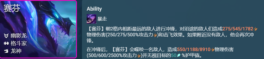 赛芬技能是有两段,第一段是进行冲锋,会造成控制加物理伤害,冲锋过程中不会被控制打断,如果撞空会继续冲撞下一个目标 。第二段是在冲锋后会有一个巨额的单体伤害,基本上在中期A到谁就秒谁 。