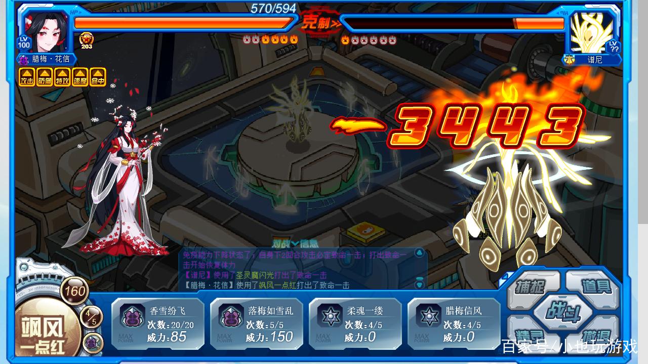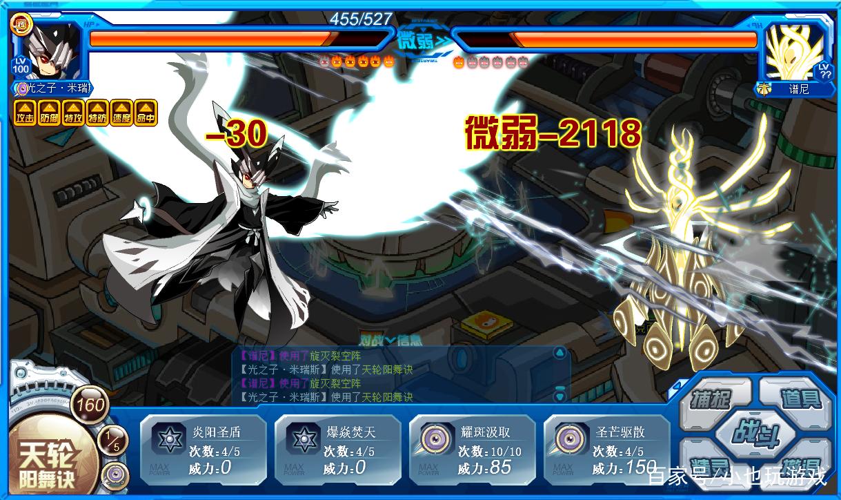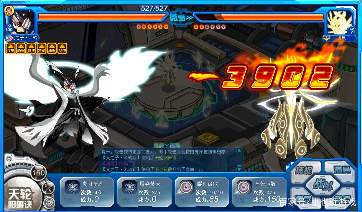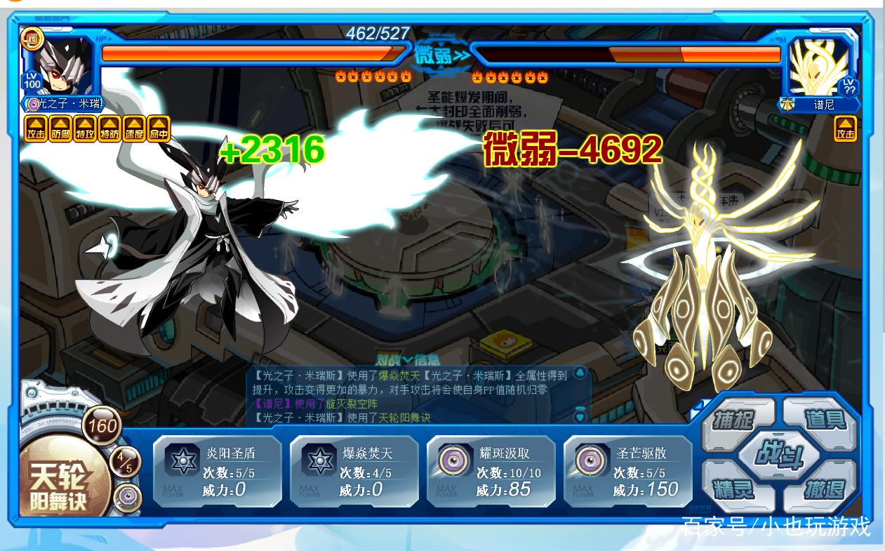 小也这个时候偷懒了,换了一只别的精灵,伤害比米瑞斯高了1000多点,不过依旧是老路子,圣光气用技能顶,其他时间直接大招。等谱尼血量估摸差不多了,直接轰杀完事!