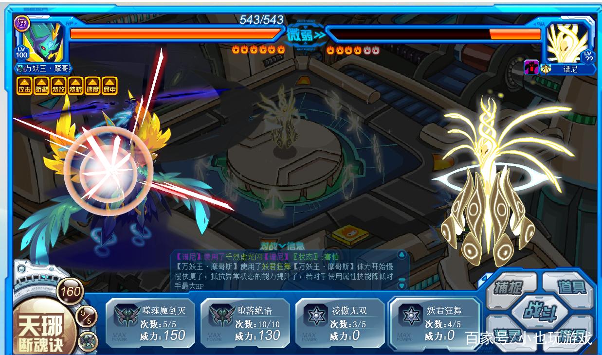 第三条命,魔焰在场可以选择继续漩涡,大概两三次后,猩猩挂掉,上鲁斯王冻伤,同样两三回合挂掉。这时候换摩哥斯,属性全加,耗招完事后,由于万妖王的被动,谱尼会持续掉血。