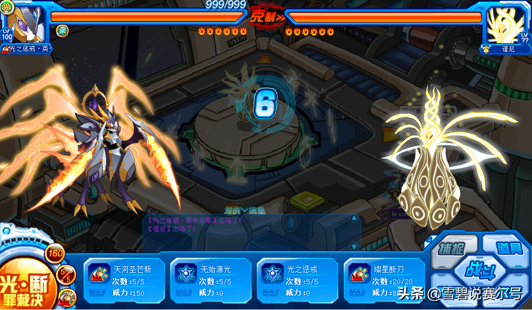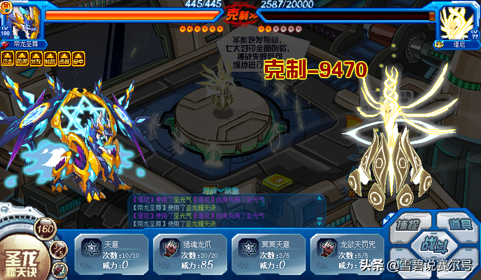 【璨灵圣光】必中,2回合内有100%概率免疫对手的攻击伤害,5回合内每回合恢复自身体力1/3,遇到天敌时先制+1,下2回合攻击必定先出手,使自身下2回合的攻击威力翻倍;