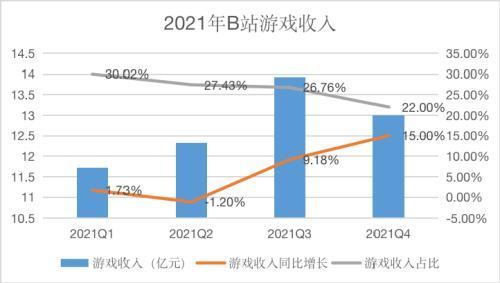 单独看2021年B站游戏表现,从第一季度到第四季度,游戏收入分别为11.71亿元、12.33亿元、13.92亿元和13亿元,同比增长分别为1.73%、-1.20%、9.18%%和15%。