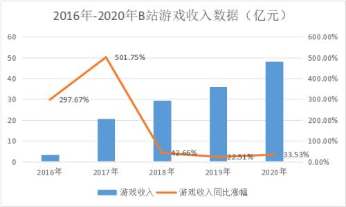 2018年开始,B站游戏收入的增速大幅度放缓。2018年、2019年、2020年游戏营收分别为29.36亿元、35.97亿元和48.03亿元,同比增速分别为42.66%、22.51%和33.53%,比2017年的501.75%一落千丈。
