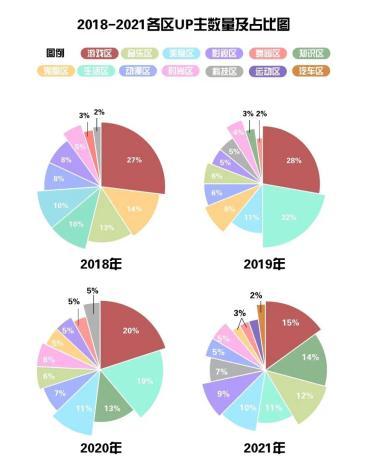 其中,游戏区UP主占百大比例从2018年的27%,降低到2021年的15%;而在2018年尚未出现的知识区UP主,在2021年的百大中占比14%。
