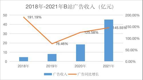 即使如此,B站2021年四个季度的广告收入分别为7.14亿元、10.49亿元、11.72亿元和15.9亿元,较去年同时段同比增长分别为233.64%、200.57%、110.03%以及120%。2021年全年广告收入为45.23亿元,较2020年同比增长145.55%。