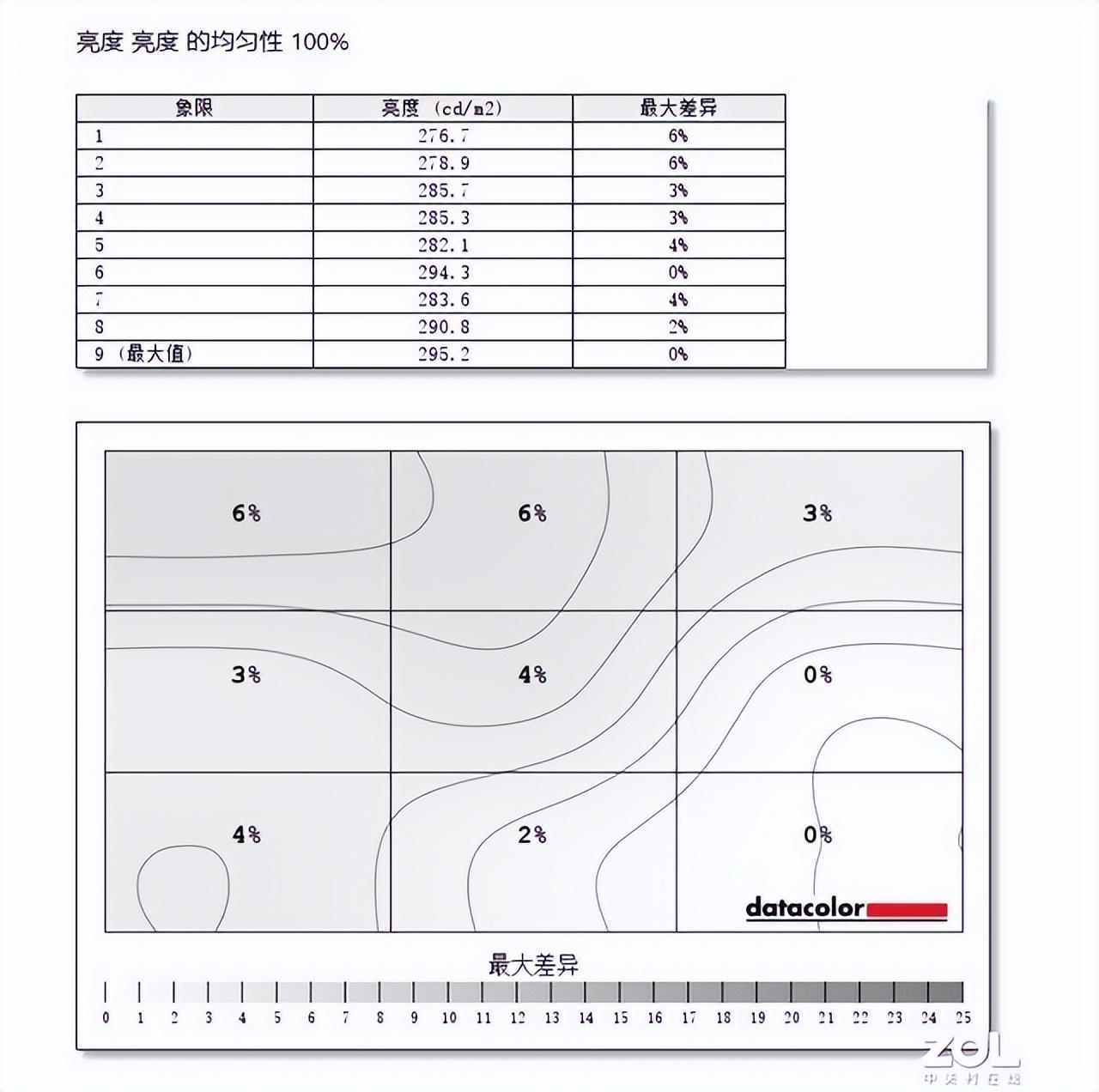 亮度均匀性的测试中,AGON AG276QZD显示器整体表现也很优秀,第6和第9象限都是0,最大差异在第一和第二象限,达到了6%。