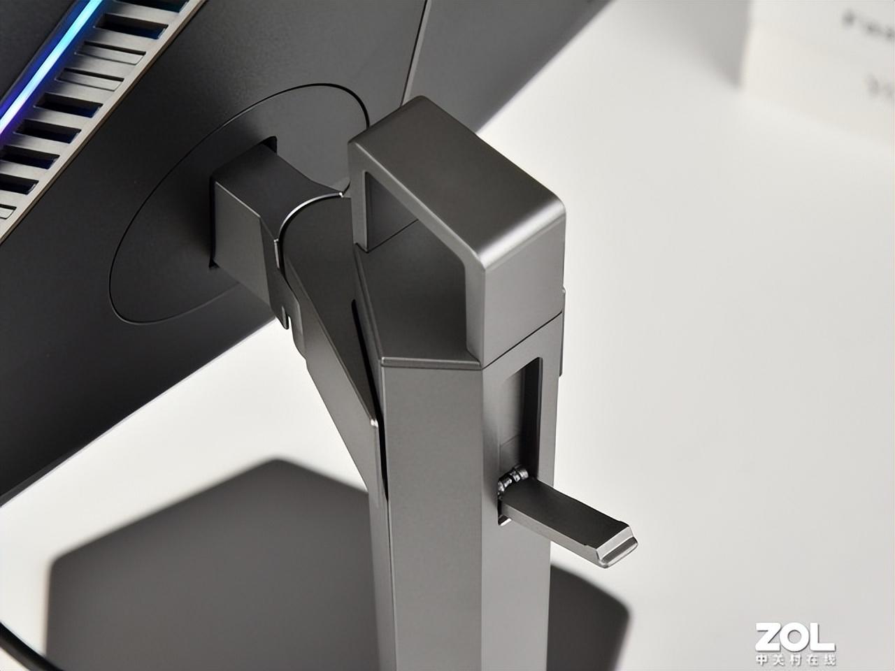 背部的支架处,爱攻为电竞耳机专门设计了一个小小的挂架,这是每一代爱攻显示器都有的标志性设计。玩家在使用完头戴式耳机后,可以将耳机挂在此处,这样做不会影响桌面环境,既方便又节省了空间。
