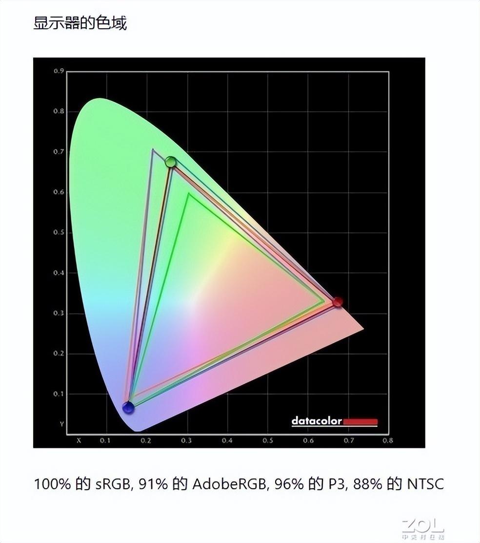 根据Spyder X Elite软件的测试结果显示,AGON AG276QZD显示器sRGB色域的覆盖度为100%,Adobe RGB色域的覆盖度为91%,P3色域的覆盖度为96%。