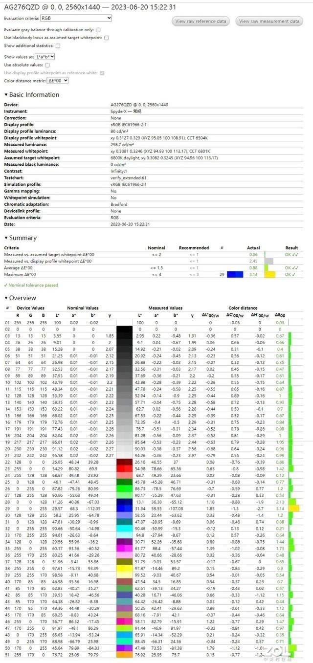 在这项色彩精准度的测试中,AGON AG276QZD显示器结果为△E值小于0.88,色彩还原十分精准,肉眼看不出色彩方面的差异。