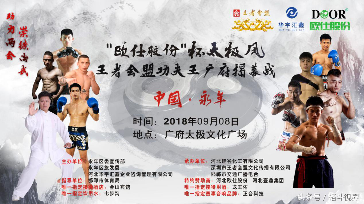 格斗世界讯:2018年9月8日,2018中国永年“欧仕股份”杯太极风王者会盟 功夫王广府揭幕战,在河北邯郸永年区广府太极文化广场震撼打响!本次比赛由河北欧仕门业股份有限公司总冠名,本次赛事阵容豪华,王者会盟两大金腰带得主全部出战,68kg金腰带梁守涛迎战播求的侄子班柴明,70kg金腰带得主列哩迎战中国挑战者李晓龙。