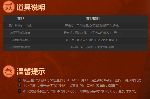温馨提示:11月17日维护后时光之约活动将会下架,时光之约获得的4种礼盒也会删除,请勇士合理安排时间使用。