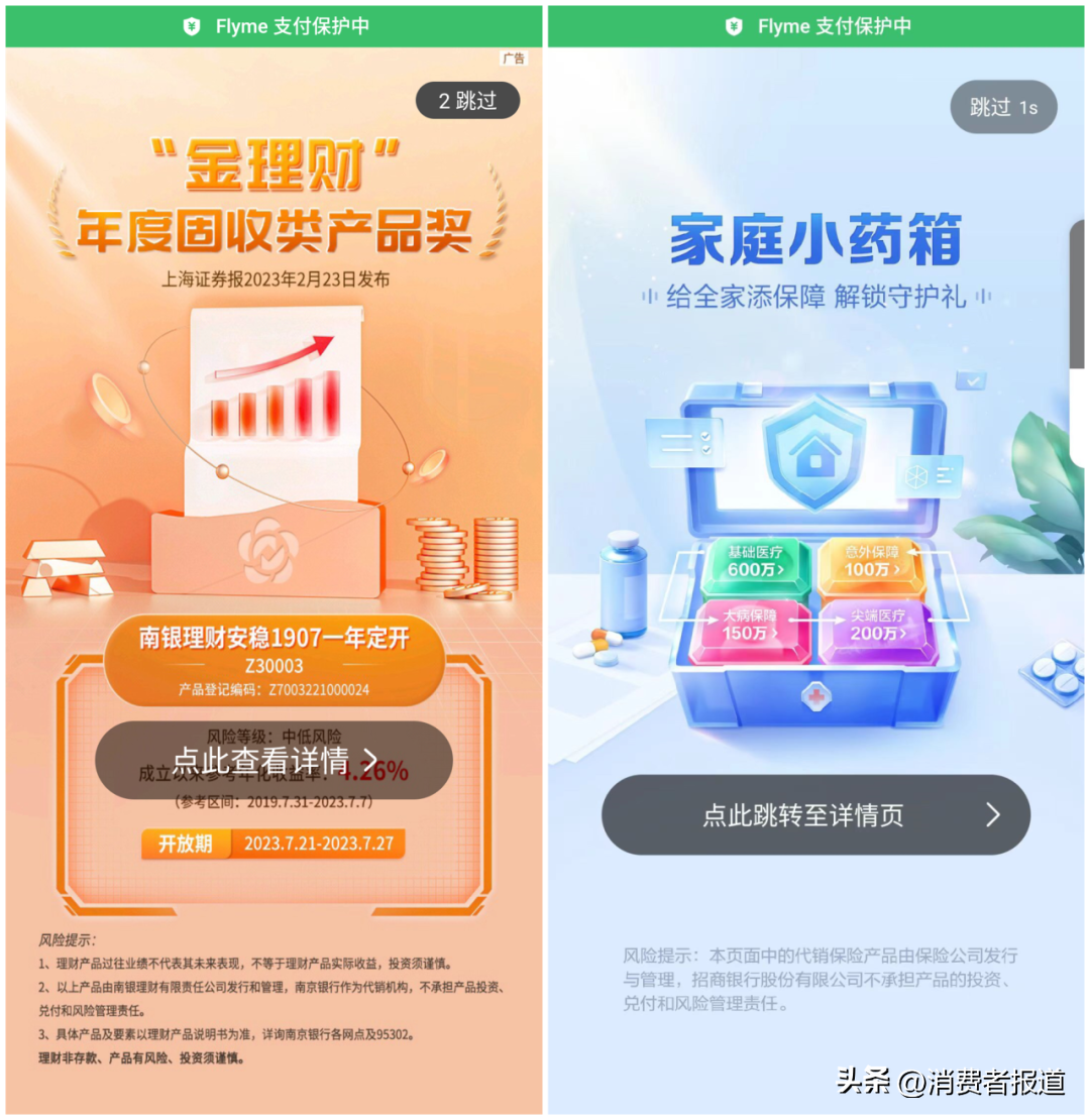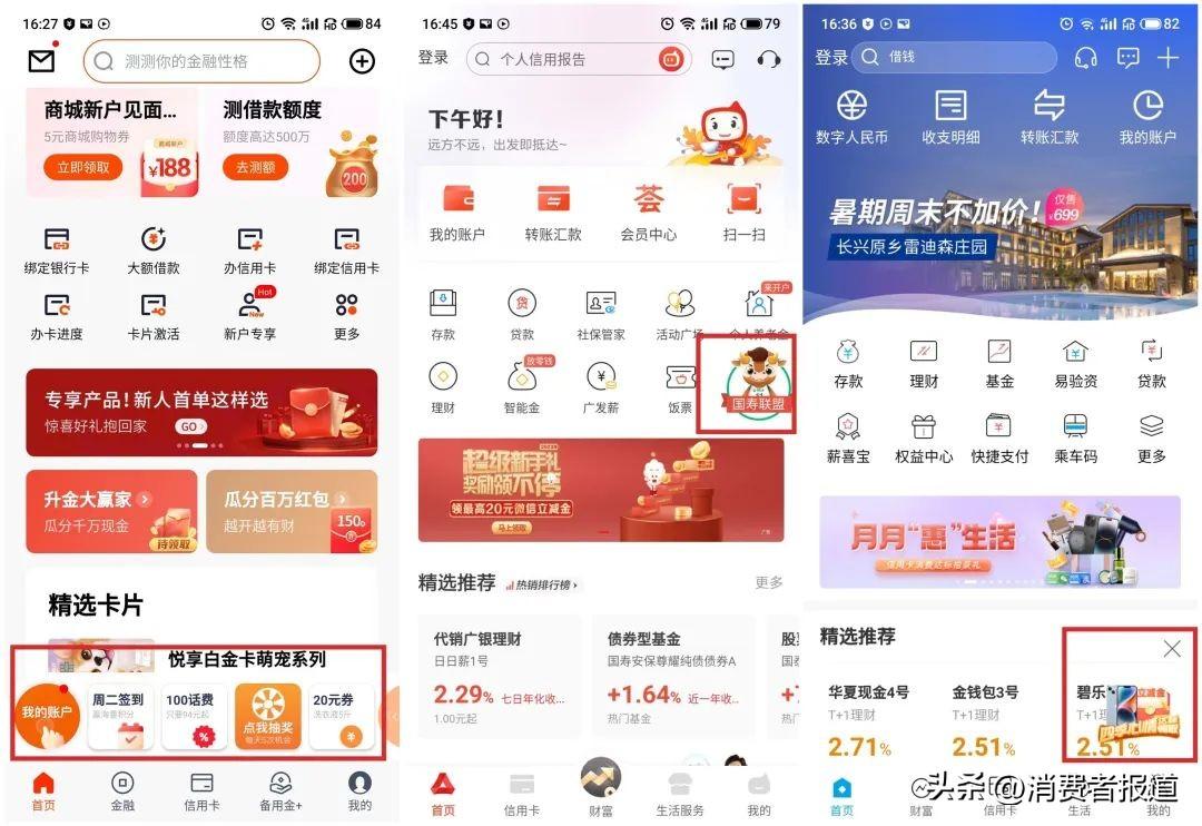 《消费者报道》发现,10款手机银行App的首页均具有各种推销和广告, 包括搜索栏滚动广告、横幅滚动广告、弹窗广告、头条广告等,内容涉及贷款、存款、基金、养老、保险、信用卡、理财产品、升级社保卡等。