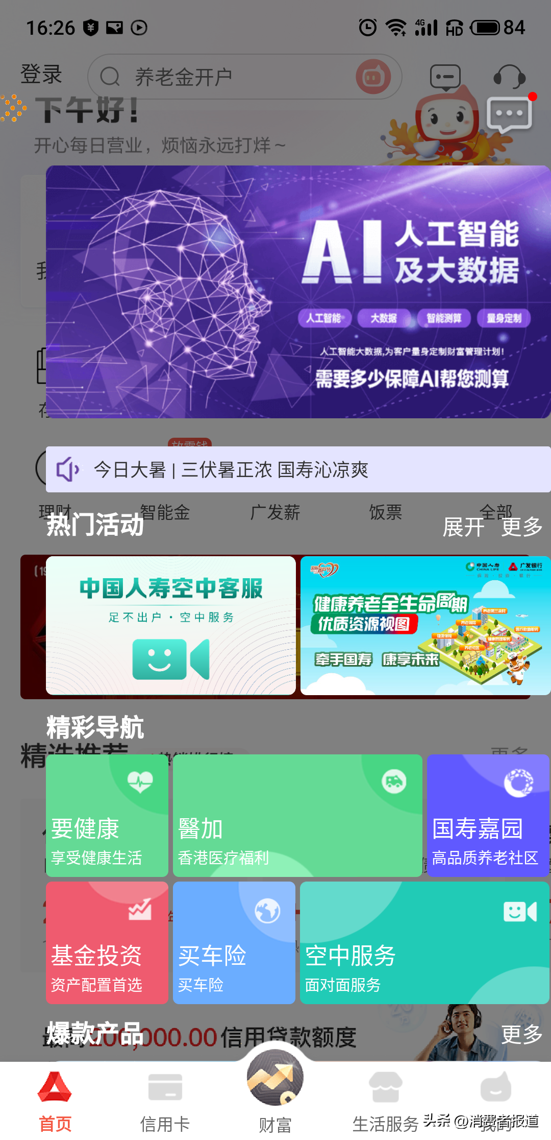 例如点开广发银行的弹窗“国寿联盟”之后,弹出较大篇幅的AI人工智能、热门活动、精彩导航、爆款产品等推广内容。
