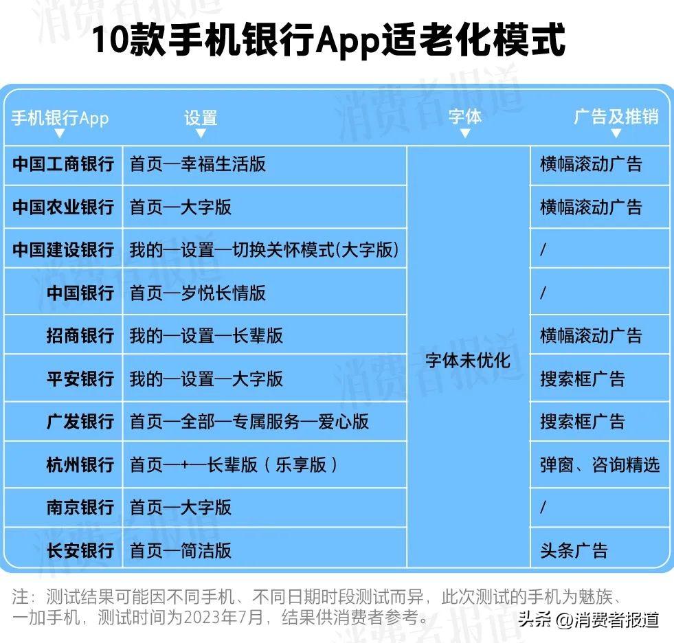 2023年7月,《消费者报道》对10款手机银行App进行了体验和测评。10家手机银行分别为中国工商银行、中国农业银行、中国建设银行、中国银行、招商银行、平安银行、广发银行、杭州银行、南京银行、长安银行 ,涉及国有大行、股份制银行、城商行。