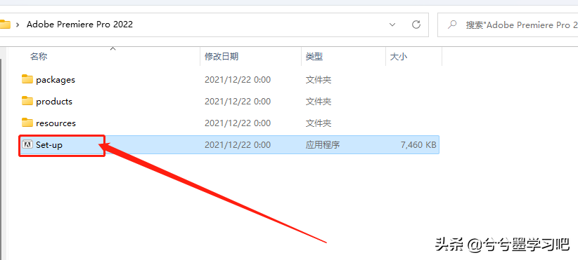 1.下载好的PR2022安装包双击解压出来,如果没有安装包可以关注微信公众号:兮兮墨 ,后台直接回复2022 ,四个数字,就可以进行下载。好,我们接着说,解压之后,双击【set-up】安装程序进行安装。选择简体中文语言,自定义安装目录安装;