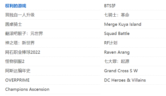 X博士我扫了眼名单,发现有不少眼熟的IP,比如和HBO合作打造的开放世界MMORPG手游《权力的游戏》。