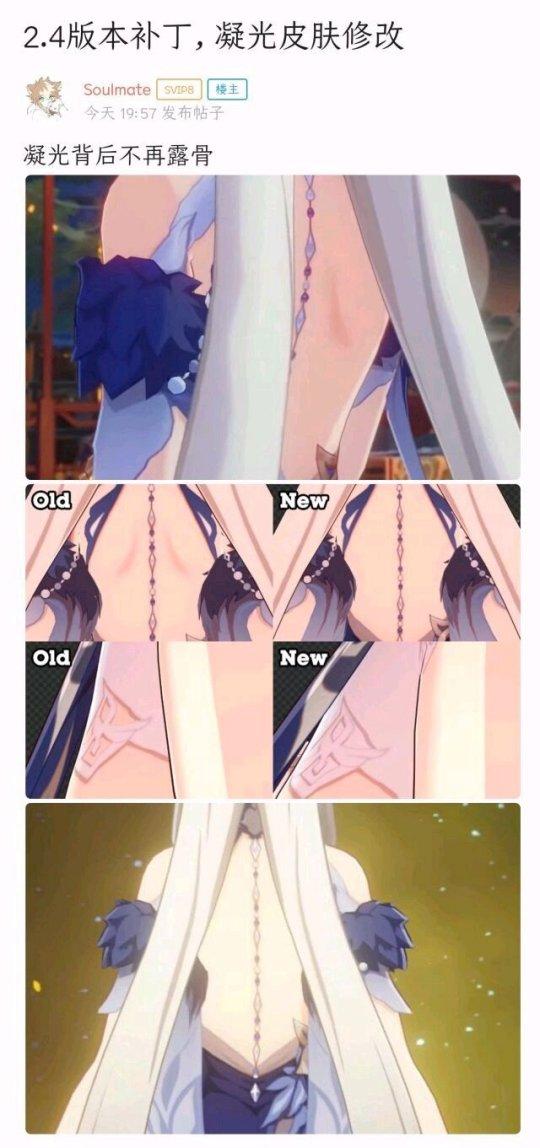 除此之外,网上还流传出凝光新皮肤将被和谐的消息,后背的肩胛骨线条消失,改成了平板。不过在29号被官方证实只是BUG,将会在2.5版本中修复。