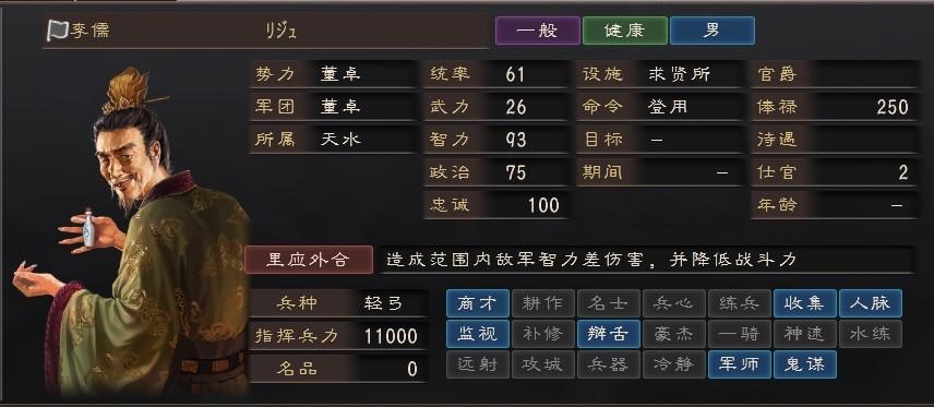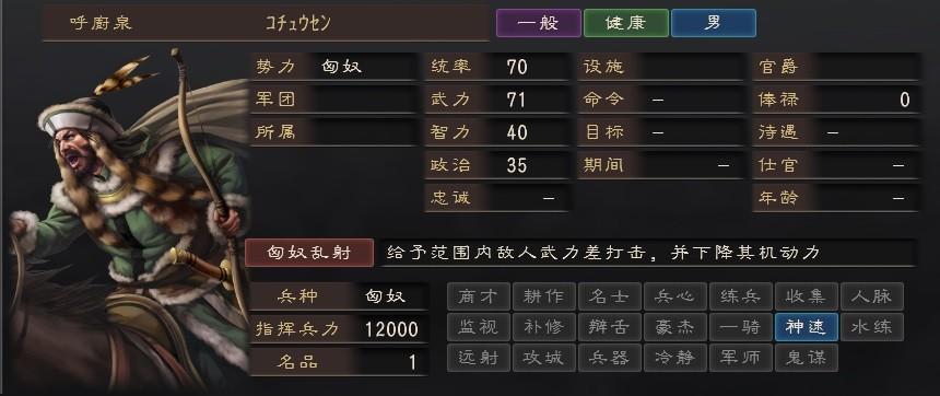 评价:指挥点数少1点,伤害指数中等,范围也少一些,武将武力不高,但是其兵种是匈奴(弓骑兵),速度与重骑兵一致,加上他会神速技能,战法减敌人速度,特别适合打跑打法。还有指挥点数6点与7点有个天渊之别:就是可以攒够满点12点再去一波连用两回再跑,北方势力如袁绍、公孙瓒等容易登用到此人。