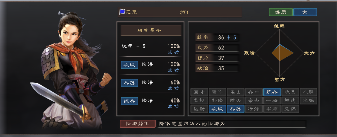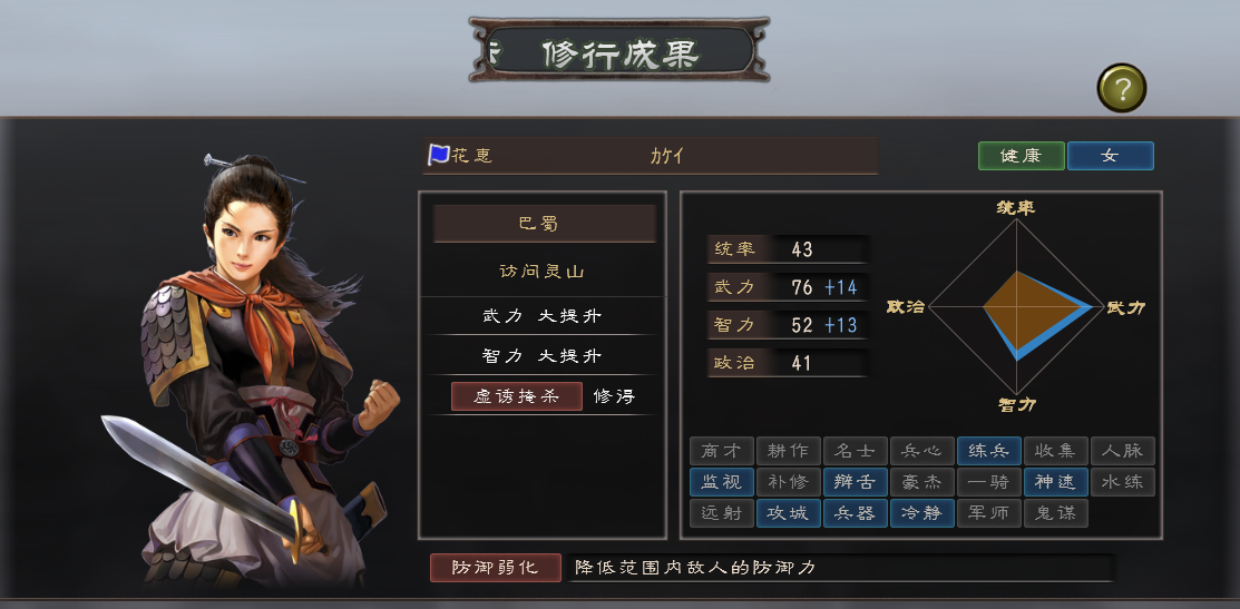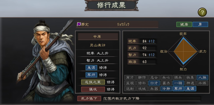 小编认为比较实用的有【鬼谋】、【军师】(不用太多)、【攻城】、【水练】、【神速】、【远射】这些。修炼时可以以技能为方向,兼顾成功率。2-3成功是正常的,要是4个全成功,那就可以值得举杯庆祝了。