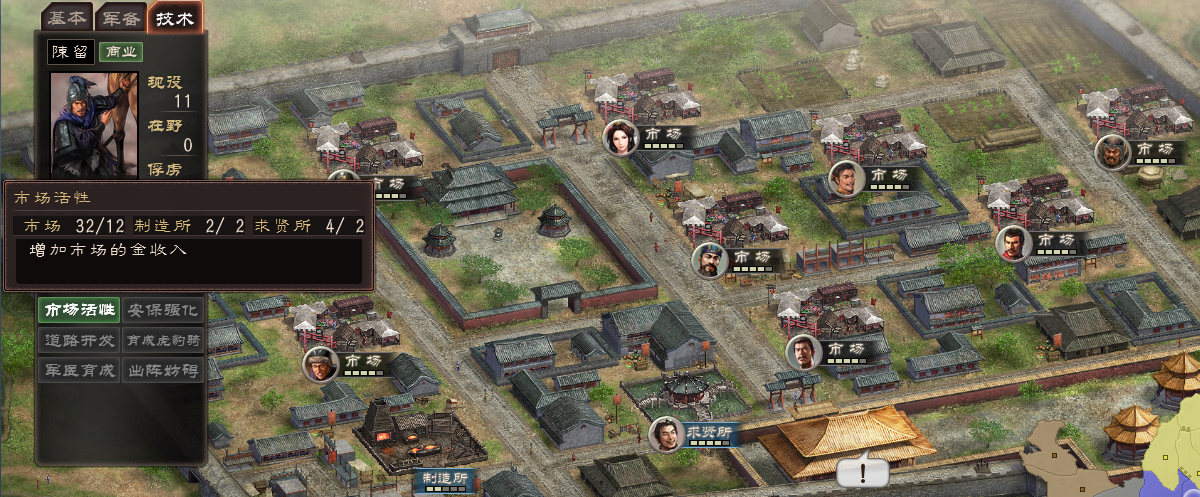 下图是一个例子,除了发掘人才,一般为了利用商业都市的特效,其余尽量建市场和增筑。(陈留还有“市场活性”,为了让大家逐步理解,这里先以大批量建市场来举例)