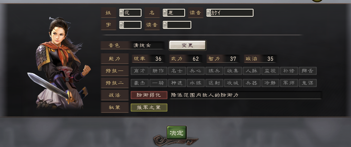 *这位培养下来有点可惜的是技能与属性不是太般配,明明有【军师】和【鬼谋】,结果智力只有86,“忘技之策”也是挺不错的妨碍技,但是智力不高的持续时间就没那么长;【一骑】倒是匹配了武力,可惜没有【豪杰】搭配。