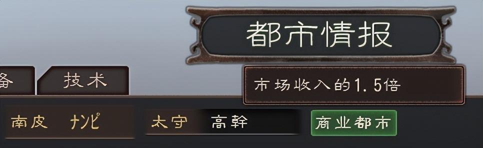 下图则是进一步利用城市技术,可以留意陈留有一项“市场活性”,除了大量市场 ,还要去有制造所和求贤所。里面的数值是叠加的=等级×数量,也就是说可以是1级×2座或者2级×1座。那么为了充分利用地方,我们当然尽量增筑。这样虽然少了1座5级的市场,但是由于激发了“市场活性”,反而可以增加金钱收入,还能减少1级市场升到5级的费用和可以登用/制造兵器。即使荒废后面两个,也是划算的。类似情况农业都市、大都市等也可以适用。