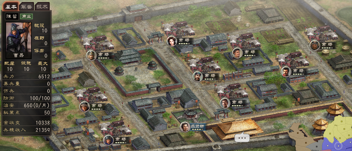 比如251的曹操,开局占领周边空城后,建议优先重兵保护陈留和发展商业,随后自己大本营许昌爆兵,再发展汝南的农业。