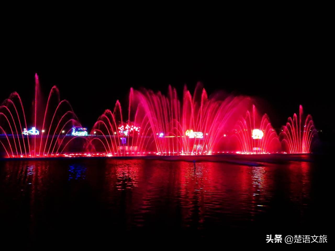到了夜晚,这里开始举行达人村夜秀。音乐响起时,湖中的喷泉喷涌而出,伴随着音乐的节律忽高忽低,忽缓忽急,而且不停地变换着色彩。