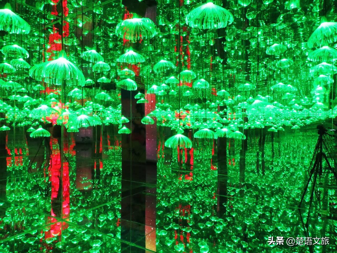 远古神话在冰雪王国的隔壁,里面的灯光秀个个都很有特色。进门通道里的阳光、沙滩和鹅卵石很逼真,踩在上面像踩在河里一样。再往里走,就是梦幻光影世界星空光影秀。这是一个网红景点,曾经红极一时,四面墙壁和天地之间都是镜面,其造成的光影效果确实很令人震撼。