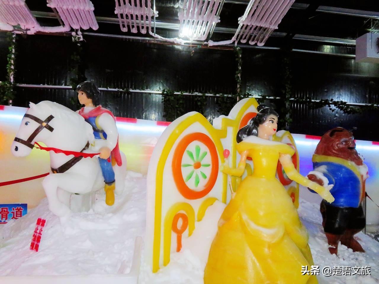 冰雪王国里非常冰冷,进去要穿上景点准备的羽绒大衣。进去后展现在人们眼前的是一个冰雪组成的童话世界。里面有冰屋、北极熊、欧洲城堡、童话故事,也有中国童年的回忆,据说它们都是用真正的冰做成的。冰雪王国里有几个要收费的项目,10元钱一人次,有点小贵。