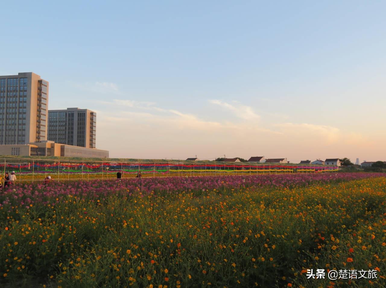 达人商铺前的田野里也是开满了鲜花。夕阳映照着这片花海和达人商铺的彩色墙绘,以及它旁边的巨大花篮,看起来像一片金色田园。