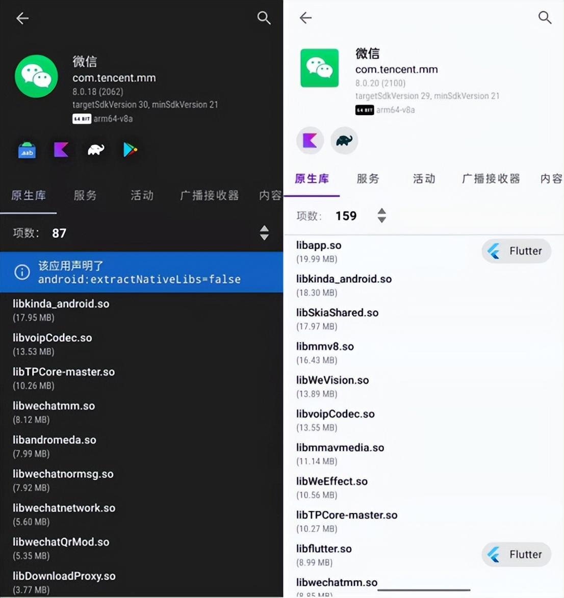 还是以微信为例,有媒体通过应用架构查看软件可以发现,微信内置了自有的X5浏览器内核,原生库项达到了150多个,而谷歌商店版的微信调用的是谷歌自家的Webview,并且原生库数量也仅为80多个,相比国内微信,少了将近一半。
