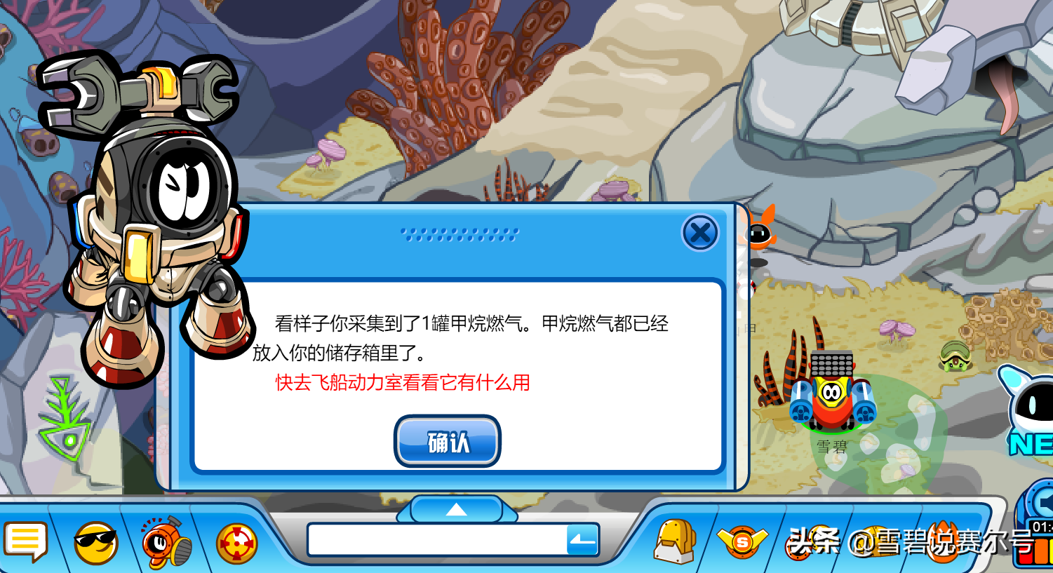 穿上维修服,去受损的地方维修,维修完得到加农炮的磁卡,接到全新的任务。加农炮在云霄星表面,还在建设中,一些任务的相关东西还没有,看来要解救飞船,破解大盗的阴谋,还要等到下次更新啊!