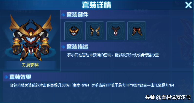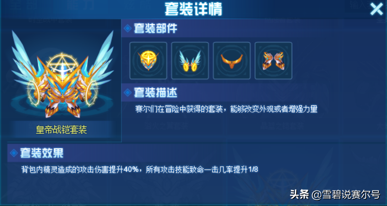 皇帝战铠:背包内精灵造成的攻击伤害提升40%,所有攻击技能致命一击几率提升1/8。 同天启套一样都是稀有度比较高的套装,一经绝版回归比较费时,一年见不了几次,而且返厂回来以后的钻石价格也在249~359之间,跟得上当前主流氪金套。