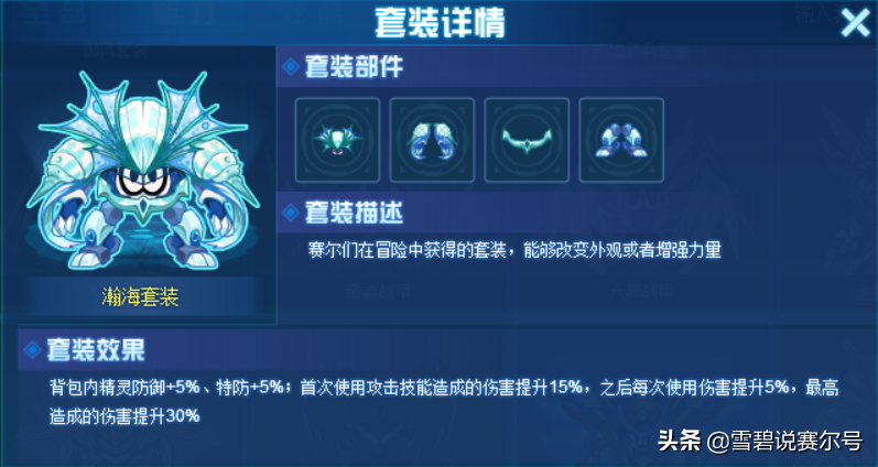 瀚海套装:背包内精灵防御+5%、特防+5%;首次使用攻击技能造成的伤害提升15%,之后每次使用伤害提升5%,最高造成的伤害提升30%。 是一个活动套装,目前绝版,但有时候活动会返厂,效益不是相当完美,还是考虑银翼。