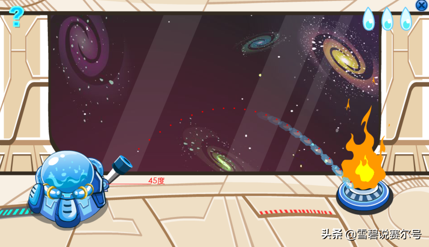 首先,去机械室,点击左边的蓝色东西,开始考验你。把水枪调至45°角,射出最远的水浇灭火焰,得到喷水套装!