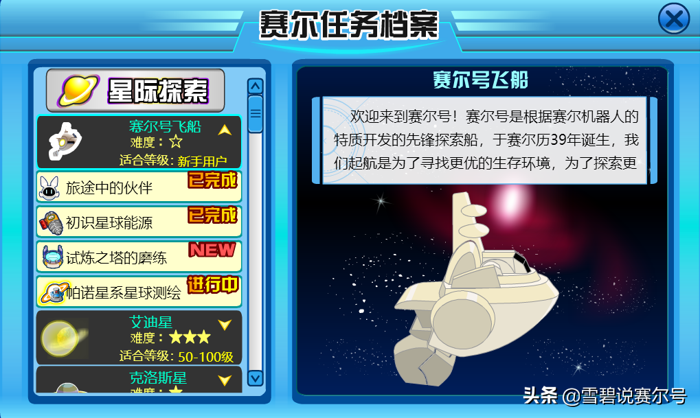 屏幕左下角有一个“雷达显示屏”,这其实就是地图,点击打开,可以直接到达宇宙世界的五个星球和赛尔号飞船的各个舱室。来到“船长室”,点击船长,他指示你去查看《飞船手册》,看完知道了赛尔号的由来。
