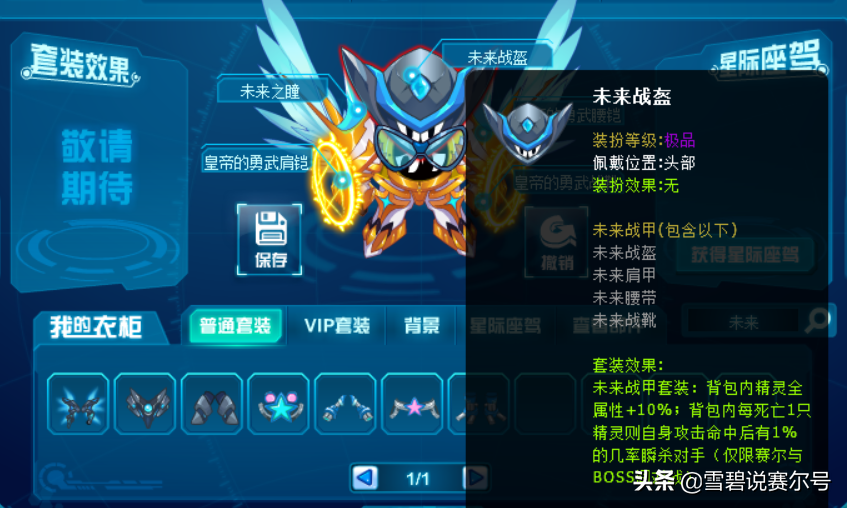 比如【未来套装】背包内精灵全属性+10%,且背包有一只精灵死亡后,自身精灵攻击命中后有1%的概率瞬杀对手,这个效果可以叠加。