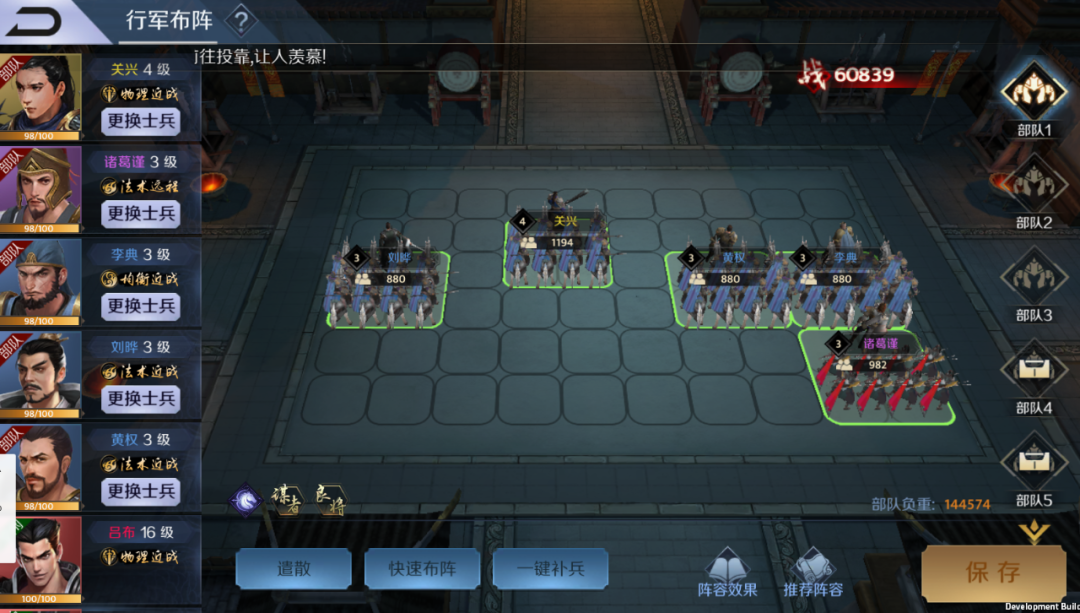 主公最多可以保存5支部队,建议每个部队排成不同的阵法,这样可以应对不同的征战需求。特别需要注意的是,近战武将携带任何兵种均为近战攻击,而远程武将只有携带远程弓兵才会进行远程攻击,所以强烈建议主公们手动进行布阵,这样才能展现出主公的策略哦!