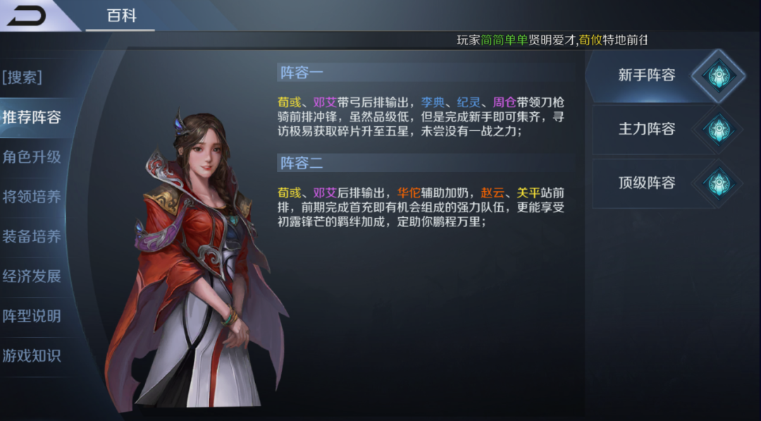 但为了能触发最强的阵型、羁绊、特性效果,是对应部队的战斗力最大化,这里小编建议大家手动上阵武将,配备阵容。布阵时一般近战武将摆放在最前面,携带防御能力较强的刀兵或者负重能力较强的骑兵,远程武将靠后摆放,携带攻击速度较高的弓兵。